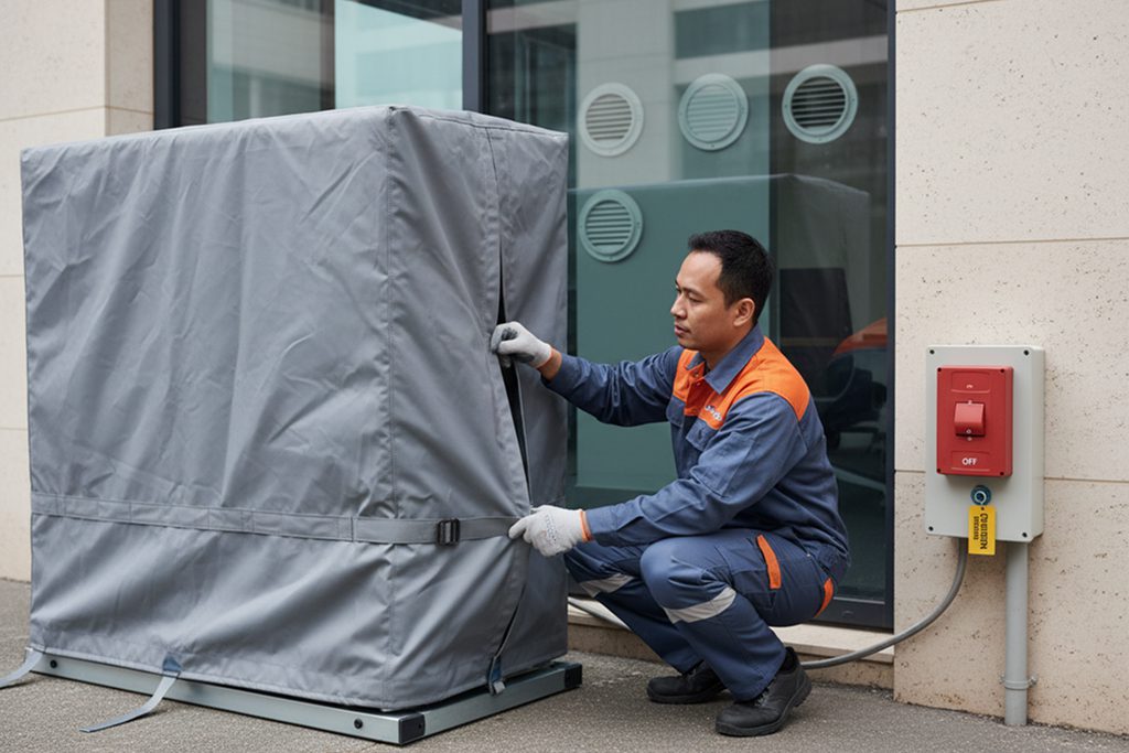 Fitting custom waterproof covers to protect outdoor compressors from debris and rain.