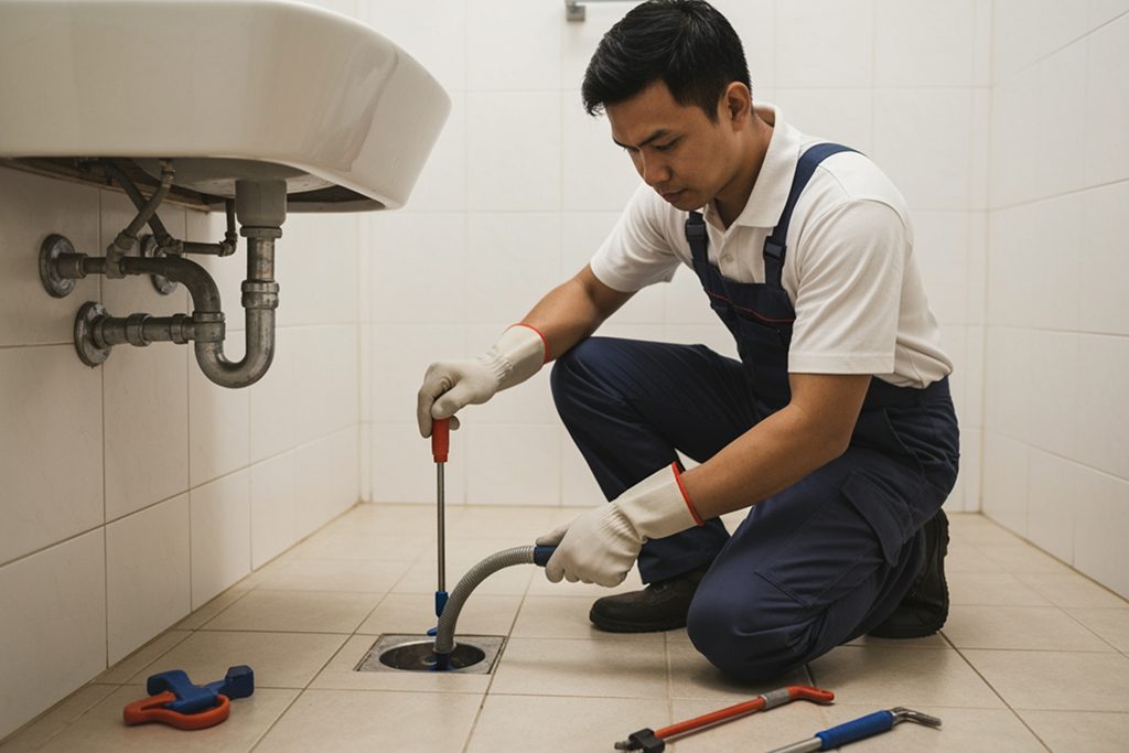 Using professional tools to clear stubborn clogs in common-area drainage systems quickly.