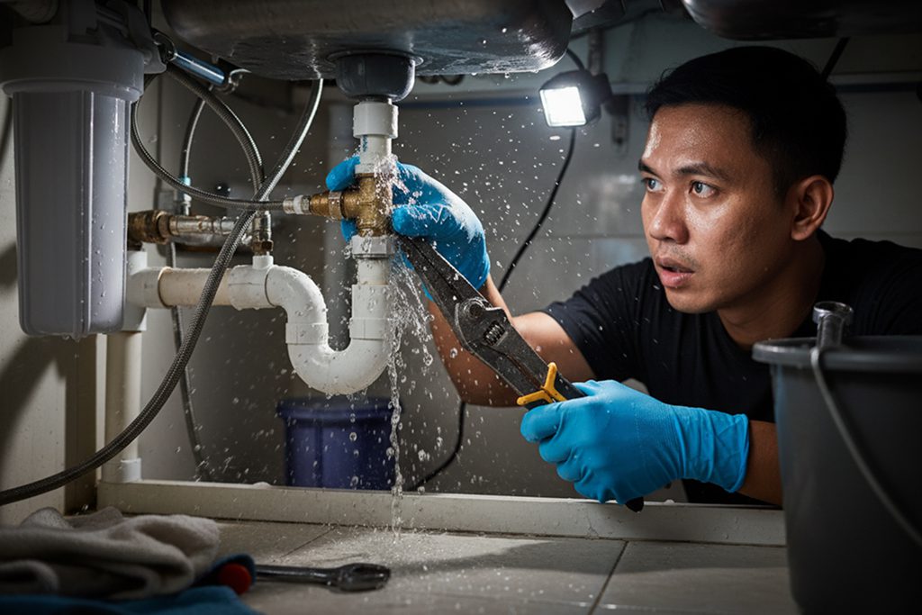 Fixing dripping faucets and blocked drains to maintain a clean kitchen area.